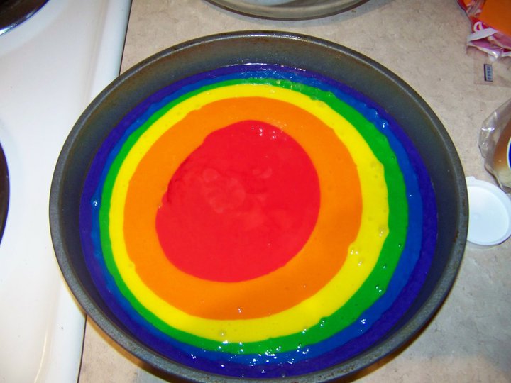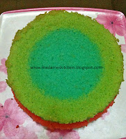 - Pour the colored batter evenly to same size pans. if you want a more uniform result later on follow the first image or the image on the left. But in my case, I only have 2 cake pans. What I did is, pour each colored batter one at a time into the pan but making sure not to mix the 2 colors 'coz the resulting color would not be very nice. The technique is like marbling. I put 4 colored batter in each pan and in equal parts and that's the image on the right side for reference.