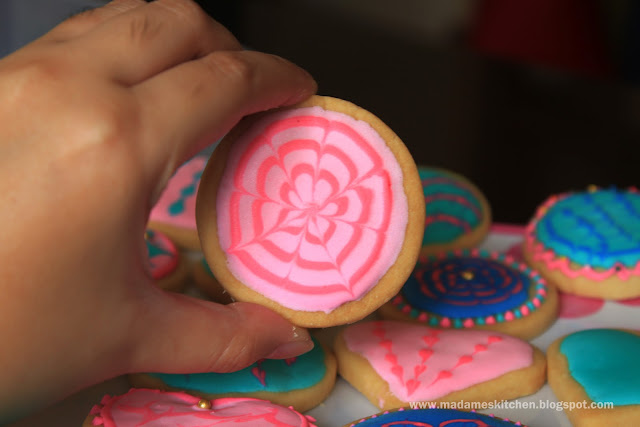 Hello to all aspiring bakers and sweety pies out there! Today, I'm going to share to you my first on-hand experience baking a shorbread cookie. I tried JoyofBaking's (Stephanie Jaworski) shortbread recipe but I was disappointed by her recipe because when I put the dough on the fridge for about 2 hours, my dough became very very hard like a rock. I followed all the ingredients and instructions she stated on her website but mine didn't turned out very well but thank God! I found myself a remedy. I thought I was gonna throw all that dough. What I did to rescue that super rock solid dough is, I waited for a few minutes for the dough to softened by massaging it using my hand. The dough slowly softened and I gradually add some flour to the dough so it will become pliable and prevent it from sticking on my hands. As to my own observation, I think her shortbread recipe lacked more flour. I added almost 1 1/2 cups of flour to the original recipe before I'm able to manage it without it sticking to my hands. Remember, do not add the flour all the way through because you cannot control how much your dough needed to become pliable. If you put more flour also to your dough, what would happen is, your cookie will be so dry and cracks will start to appear. This is only based on my own experience. I'm so glad my brain worked out that I need to add more flour to it or if it didn't, I would've wasted everything. It's also my first time to finally use the marbling technique in royal icing. I really wanted to try this technique ever since. But I can't find a good recipe for the cookies to use it for.