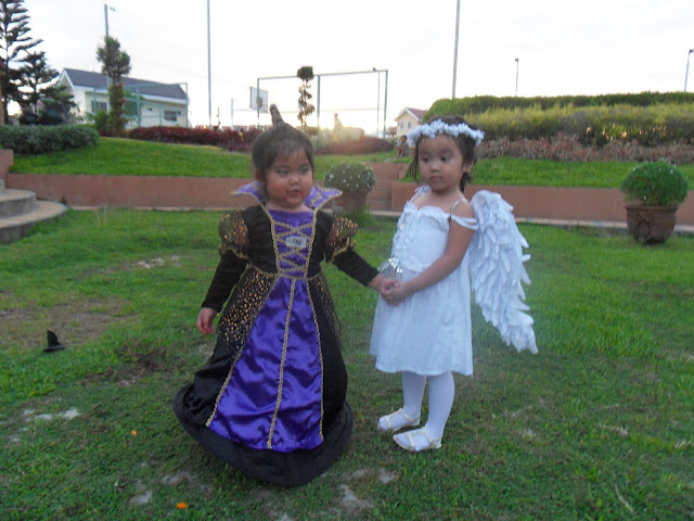 Good vs. Evil costumes. Congrats to Zanny (left) for winning the most creative during the annual Halloween celebration here at Toscana Subdivision. On the other hand, Zephy (right) didn't interact that much during the contest. She just played with the kids at the club house where the party was held.