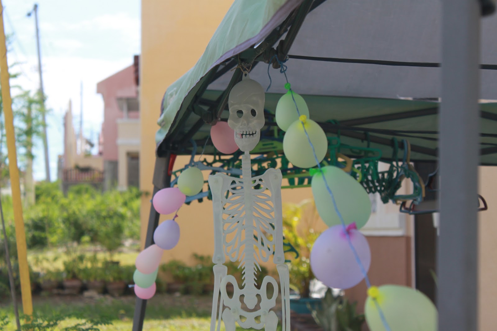 Glow in the dark Skeleton hanged outside ready for the night's celebration