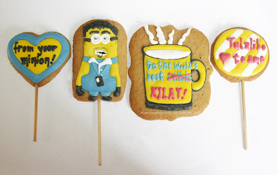 July is a very lonely month for me since nobody ordered a cookie bouquet but this August, I'm fully booked. One thing that made me feel so excited was when I received a minions cookie bouquet order. If you don't know about minions then you'll miss half your life. They're little helpers of Gru - The World's No. 1 villain in the world from the movie Despicable Me. The process of making these cookies is really fun since you can make your own minion out from your imagination. I also copied some of the minions from fan arts found in the web and tweak them a bit. Anyway, this cookie bouquet is for a guy. Her girlfriend wants to surprise him a new kind of present this year aside from the regular gifts they used to give to each other. I even make a minion out from his boyfriend's photo and good thing, she actually recognizes it as his boyfriend because of the eyebrows. For those of you looking for guides and inspirations on how to make minions cookies, just browse at my photos below. Tulalibo To Amo guys!!! (speaking minions meaning "I love you")