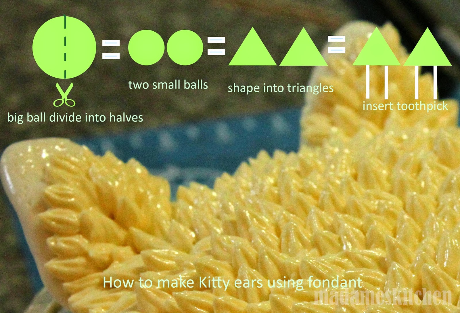 To make hello kitty ears, you will need a medium size ball then divide it into halves then shape it into triangle using your fingers and poke a toothpick or spaghetti stick to hold them in when you stick them to the cake.