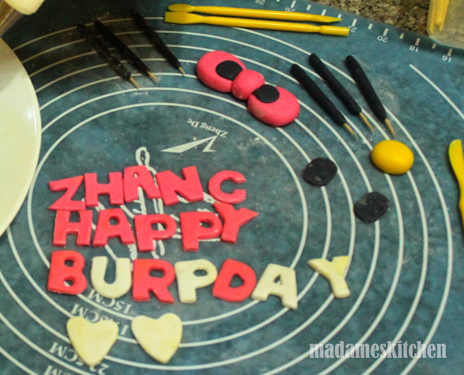 2. make the ears, bow, nose, whiskers and other accents to go with your cake using fondant